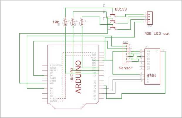 2. un 8 - bit multiplexor, esto nos ayuda a reducir el número de pines PWM requerido por el Sensor. Lo hace por sólo uno de los pines PWM para conducir los tres leds RGB en tres diferentes valores de la multiplexación.