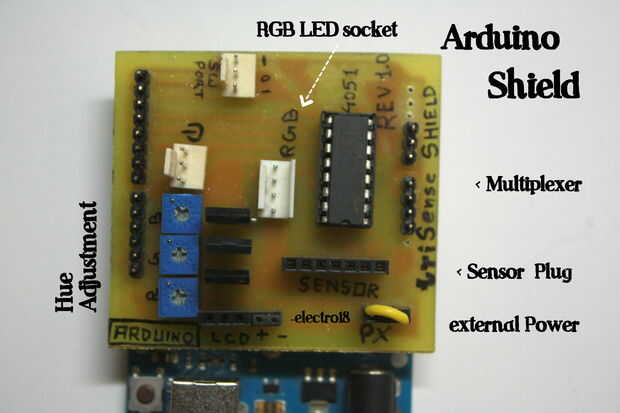 El "corazón" de la lámpara es el escudo - (escudo de TriSense) que se monta en un Arduino Uno.