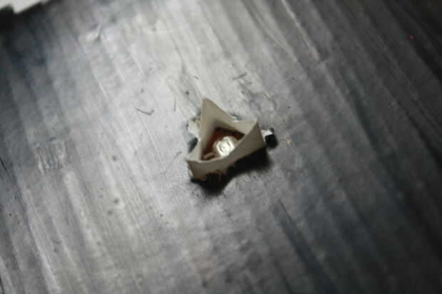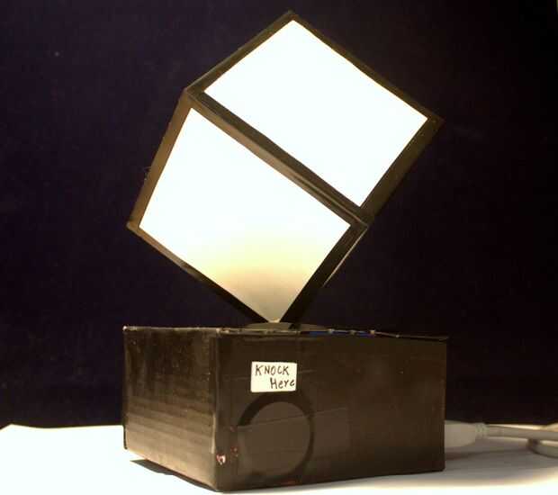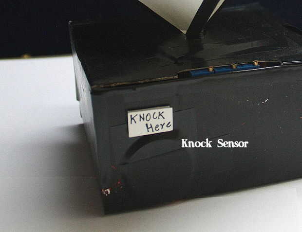 Para completar el cuerpo, pegar el difusor en el LED. Coloque el sensor Knock en el exterior de la caja y asegure con cinta aislante negra.
