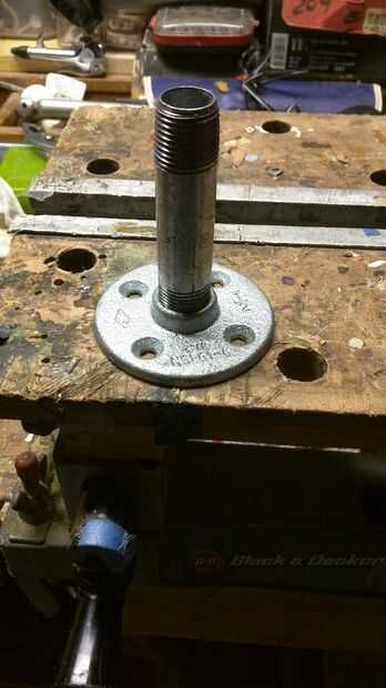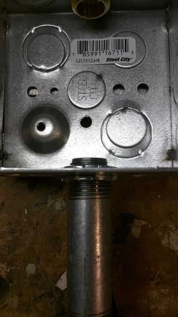 A continuación coloque el niple de 1/2 y brida en la parte inferior de la caja utilizando dos tuercas de fijación, la conexión de 1/2 - 1/8 reductor a la parte superior con otro. Apriételo con las llaves, después Atornille la varilla de 1/8 de elección en el reductor. Te recomiendo una caña de 2-3 pulgadas. Usted podría ir más para un tono más alto.