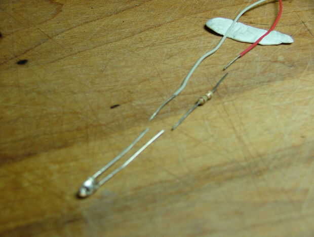 La pata larga del LED es +, por lo que la resistencia debe soldarse a esto, es el tiro de la pierna - o tierra. Ignore el cable blanco en esta foto debe haber sido un negro!