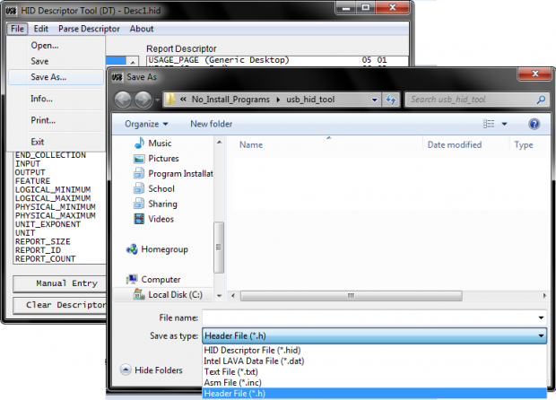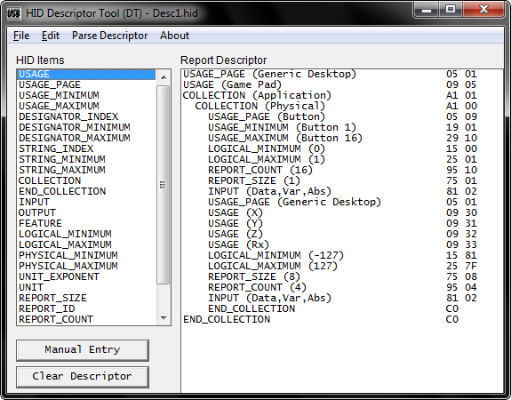 Ahora que ya tenemos un descriptor de informe, ¿cómo hacemos nuestra AVR Dile estas cosas al ordenador? Ir a descargar la herramienta oficial de"HID Descriptor" de http://www.usb.org/developers/hidpage/ . Se usa para poner estas cosas en, y la herramienta generará la matriz binaria correcta para usted.