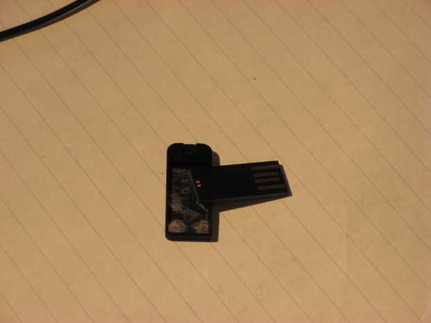 La segunda imagen muestra las tripas y el pendrive insertado en el blindaje para una prueba.