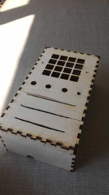 La caja de madera se realiza utilizando Adobe Illustrator y un cortador láser. Su un 180 mm x 60 mm x 100 mm tamaño caja hecha con makercase.com el material es de 3mm de espesor y tiene los bordes de los dedos. Encima de la caja son los agujeros de las macetas y el enrejado en. El fondo de la caja tiene bordes planos, que esto es importante para más adelante.