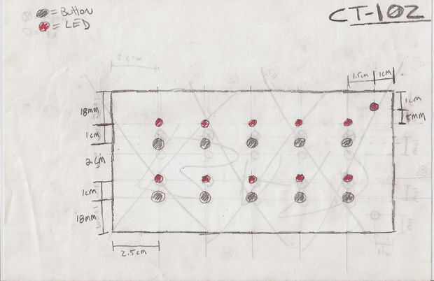 Crear una plantilla para su dispositivo. Botones separados para facilitar el acceso del espacio pero no demasiado cerca que accidentalmente el gatillo. Incluyo mi proyecto que es para un 15 x 10 cm x 6 cm caja de proyecto. Opté por usar la base de la caja porque no quiero ver los tornillos.