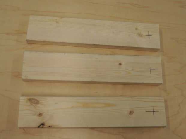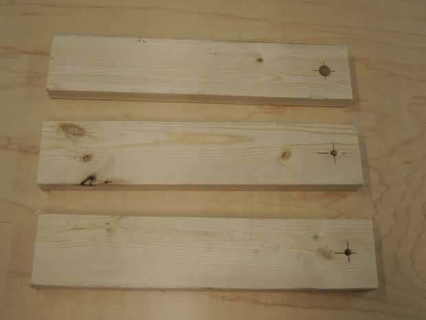 2. Perforar las otras dos longitudes de la madera con orificios de 1/4"(o cualquier anchura su pincho) 1" de la parte superior. Mantenerlo centrado!