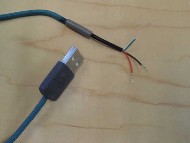 1. Pele uno de los extremos de los cables el cable USB para que los cables internos están expuestos para la cables rojo y negro. Según el cable USB que está utilizando, puede haber algunos otros cables de colores dentro, así - puede ignorar aquellos, sin necesidad de quitarlos (por ejemplo, en la imagen de arriba, ignora los cables internos teal y blanco)