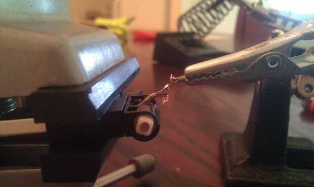 Para la soldadura de los cables, asegure una mitad del mazo en una Panavised o uno de los clips de la tercera mano y la segunda mitad del mazo a otro de los clips de la tercera mano. Debido al espacio limitado dentro de la vivienda y a través del cual pasa el mazo de cables, opté por no trenzar las dos mitades del alambre. En cambio, destrenzar los hilos de la mitad y destrenzar los cables de la otra mitad del cable así. Luego juntar a ambos y apretarlas para que acoplamiento juntos. Ahora la soldadura. Siga estos pasos para todos los cables. Recuerde soldar blanco con blanco, negro con negro, verde con verde y rojo con rojo.