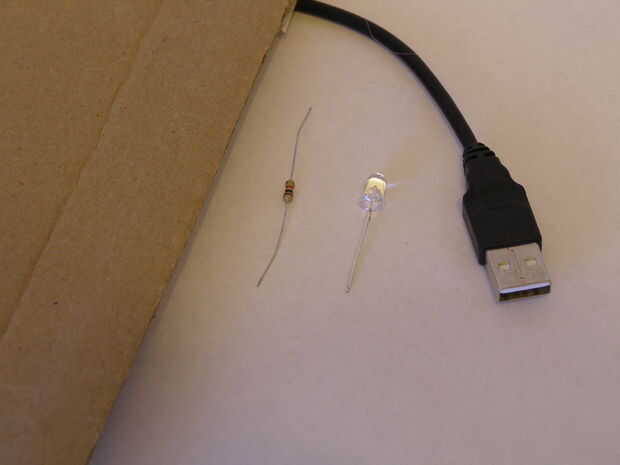 R es resistencia en ohms, V1 es el voltaje en voltios de la fuente (5V por USB), V2 es el voltaje delantero de LED en volts y es la corriente en amperios. Más que probable que su LED tiene un consumo de corriente de 0.02A (o 20mA), pero la tensión de paso puede ir desde 1V a 3.5V. Terminé usando un resistor con un valor un poco menos de la ecuación me dio para hacer el LED un poco más brillante, pero cuidado, tener demasiado bajo de un resistor puede freír tu LED.