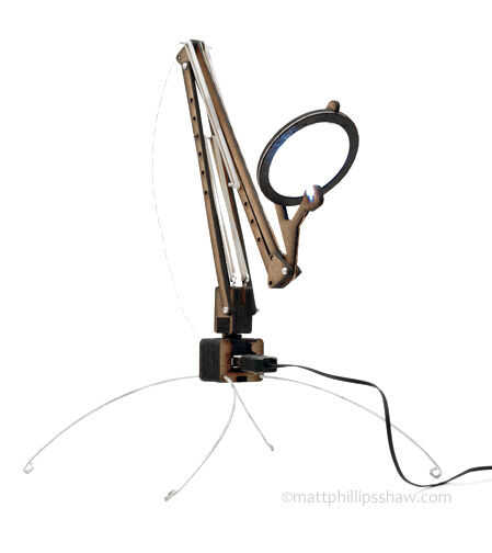 Corté las piezas de 1/8 de pulgada masonite con un grabador de láser de Epilog que estaba disponible en mi universidad. Diseñé las piezas a ser capas y pegadas para formar componentes tridimensionales que podrían atornillados y cubrió juntos para crear una lámpara articuladora completamente funcional.