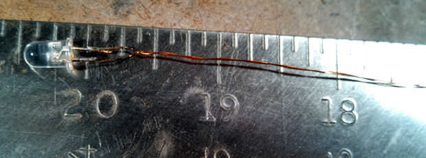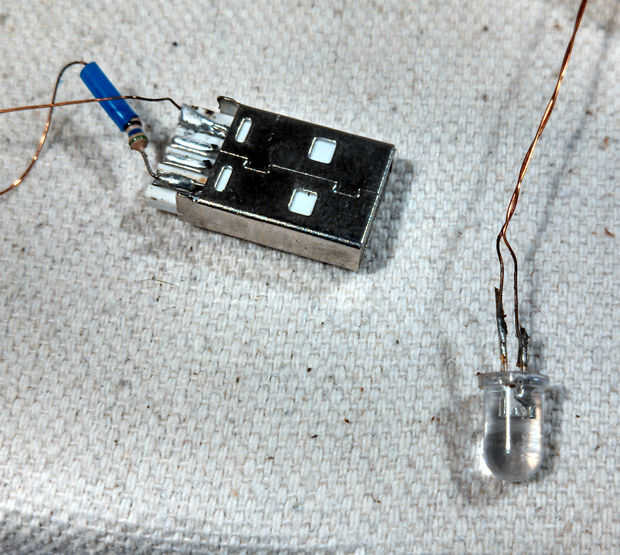Reemplazar los cables originales con dos hebras (aproximadamente 20 pulgadas de largo) de alambre de Magneto recubierto de esmalte más elegante y me movió la resistencia desde el LED al enchufe USB para no verse más tarde.