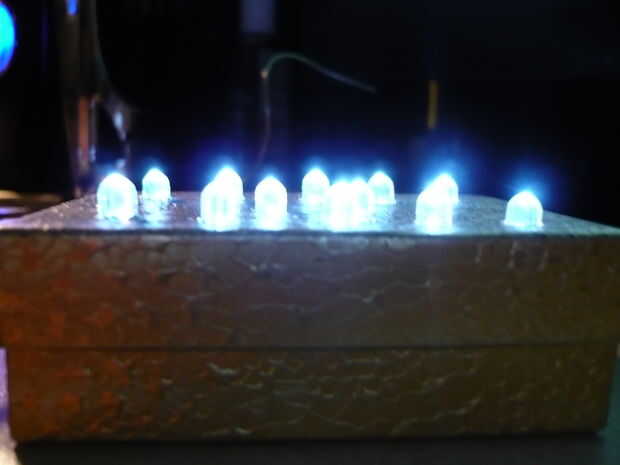 reunir los siguientes materiales1 adaptador de pvc de 4 x 212 LEDPistola de pegamento calienteSoldadura de hierroDe la soldaduracinta aislantecable de altavozFuente de alimentaciónPaso 1: 1) taladro 12 agujeros en lugares de deseos de 4 x 2" adaptado