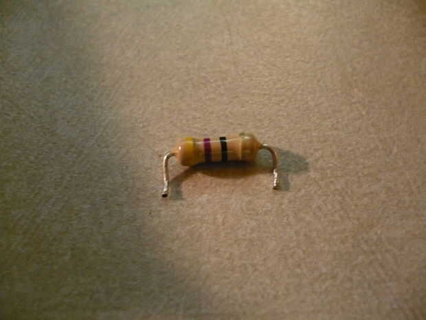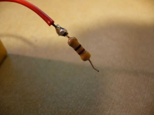Después de las dos secciones de cable rojo conectado a los pines que ahora tendrá que añadir una resistencia. Para este proyecto utilicé un resistor de 47 ohmios (que era más que suficiente... pero mejor seguro que lo sentimos.) para averiguar qué resistencia de tamaño que se se necesitan te puede ir a [http://metku.net/index.html?sect=view & n = 1 & ruta = mods/ledcalc/index_eng] ahora conectar el último tramo del cable rojo al otro extremo de la resistencia y la soldadura en el lugar.
