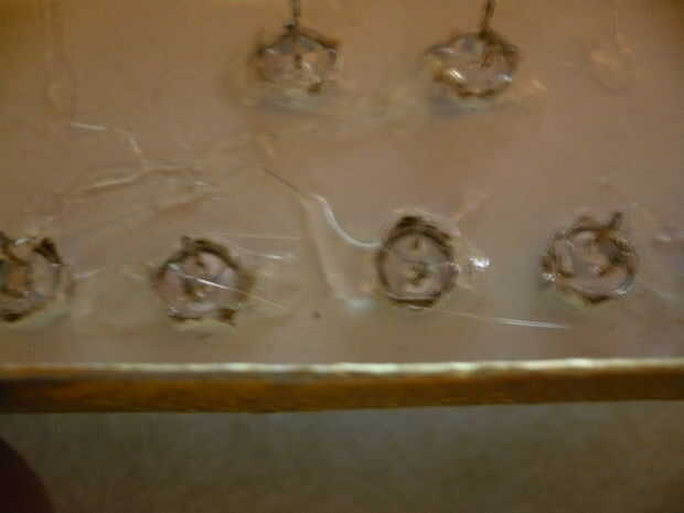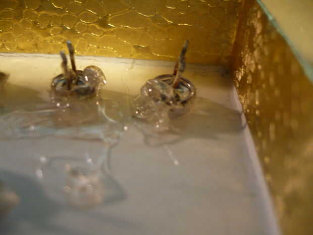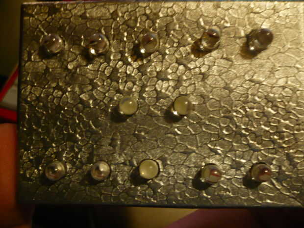 Ahora que se hacen los agujeros, ahora puede colocar los LEDs en los agujeros. Asegúrate de que pones los LEDs en desde abajo, porque el anillo en el LED le ayudará a garantizar dentro. Algo muy importante tener en cuenta es que todos los LEDs deben ser igual. En otras palabras, cada ánodo debe ser de la derecha, y cada cátodo debe estar en la izquierda. Después de que son empujados en su lugar y cada ánodo y cátodo Alinee correctamente usted ahora debe usar una pequeña cantidad de pegamento caliente para mantener sólo el plástico del LED en su lugar, no quiere mucho pegamento en las patas del LED porque los LEDs soldados todavía.