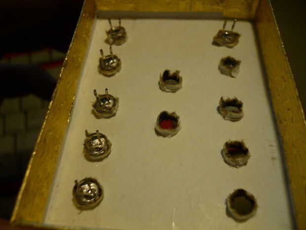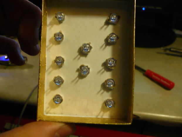 Para hacer los agujeros para los LEDs, encontré que era más rápida quemar cada orificio con su cautín y desde allí expandir el orificio con un destornillador o algo suficientemente grande.