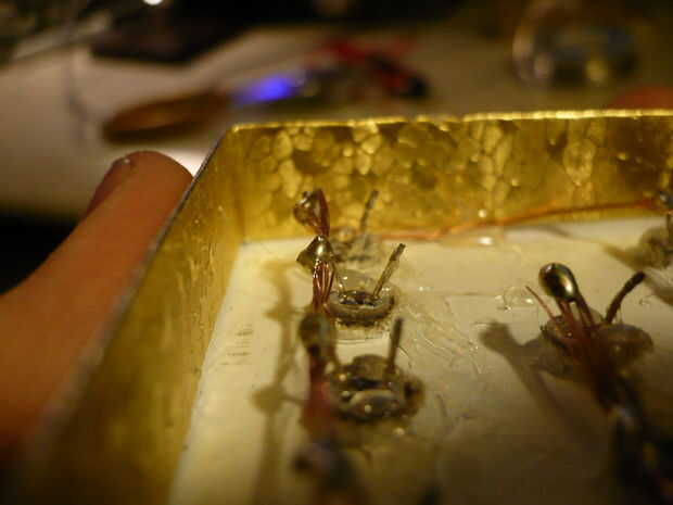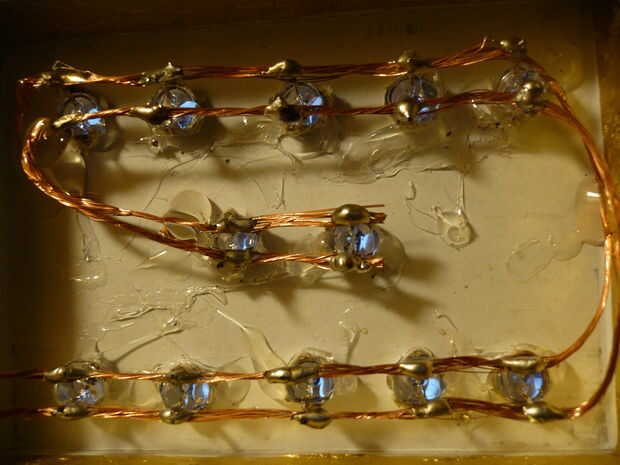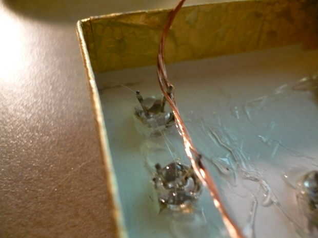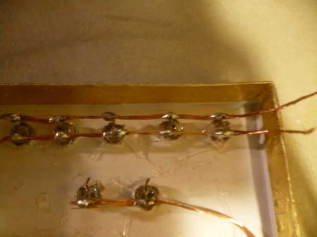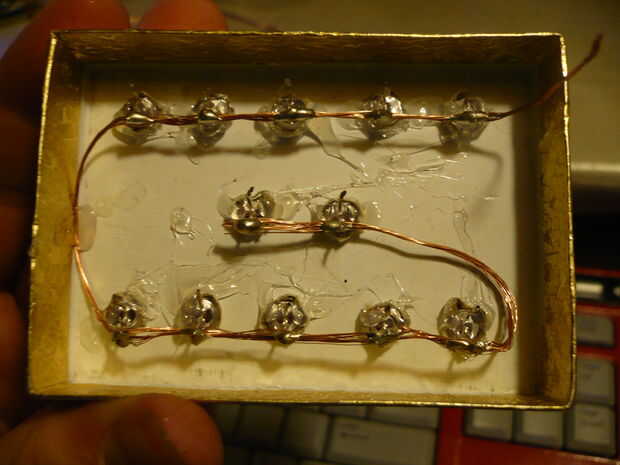 [Los cables entre cada LED va a ser pelado, asegúrese de añadir algunos pegamento caliente a los alambres superpuestos para mantenerlos separados, de lo contrario se cortocircuito en el circuito y los LEDs que parpadean o no enciende en todos]