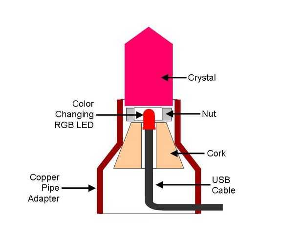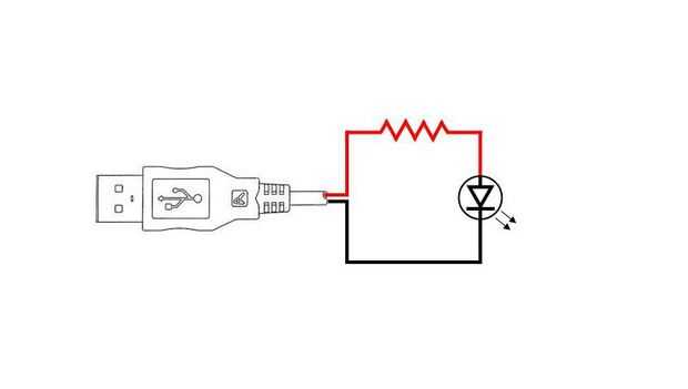 El circuito de la luz es igualmente simple como se muestra en el esquema en esta página. La resistencia es soldada a un cable del LED (el "ánodo") y luego soldada para el cable (rojo) "positivo" el cable USB. Se suelda el otro cable del LED al cable (negro) "negativo" en el cable USB. El color cambia la magia ocurre dentro de la LED-no hay necesidad de ninguna electrónica externa.
