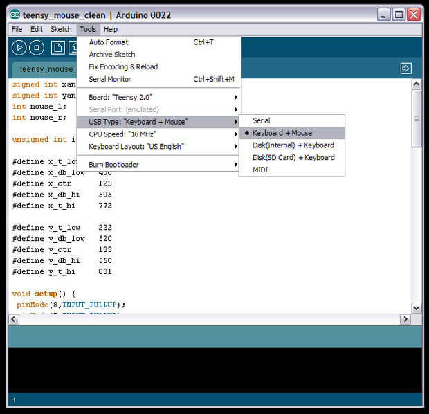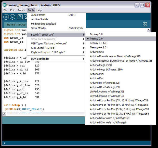 Una vez que has conectado todo según la tabla anterior, estarás listo para programar. Además de poner el código adjunto en la ventana de Arduino, asegúrese de que la configuración es correcta para este proyecto. La Junta debe ser identificada como "Teensy 2.0" y el USB tipo "Teclado + ratón".