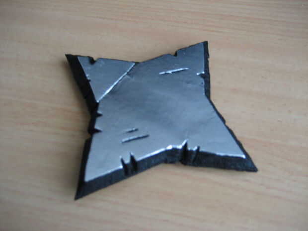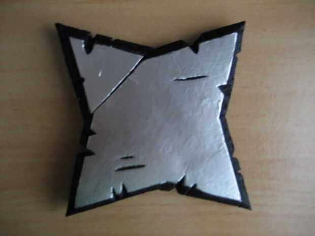 Decidí pintar mi Shuriken negro con pintura de acrílico para sellar la espuma y luego recubiertas de pintura en aerosol y corte muescas para dar un toque de roto y maltratado. Luego cubre los lados en papel de aluminio y volver a cortar las noches para hacerlas visibles.