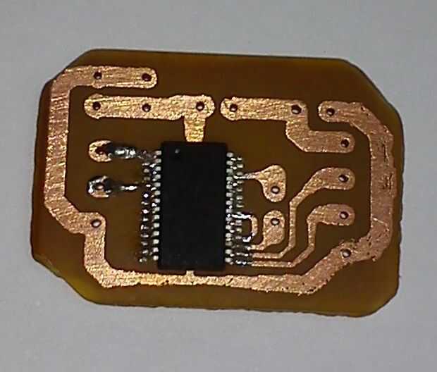 Fije un alambre estrecho hasta la punta del soldador (puede utilizar las patas de los componentes electrónicos). Poner alguna soldadura en el PCB donde debe colocarse el FT232RL IC. Poner el IC en su lugar cuidadosamente sostenerla entre los dedos y el puesto de soldadura en sus piernas una por una. Observe la dirección de IC (el punto debe ser uno el lado opuesto del USB).