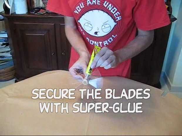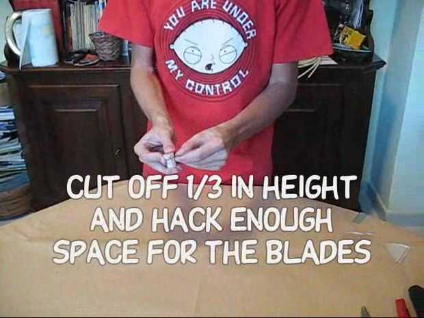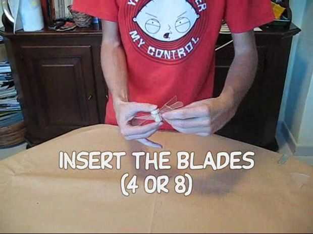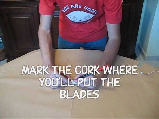 El corcho donde pones las cuchillas de la marca. Hacer un pequeño agujero en la parte inferior. Cortar 1/3 de altura y hackear suficiente espacio para las hojas. Introduzca las hojas (4 u 8) y fíjelos con súper pegamento. Deje que se seque :)