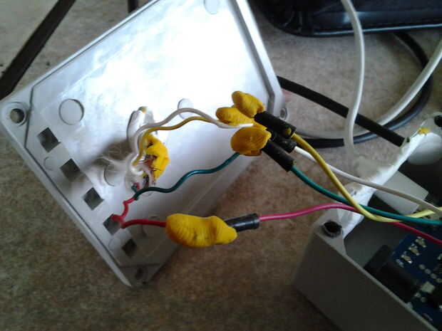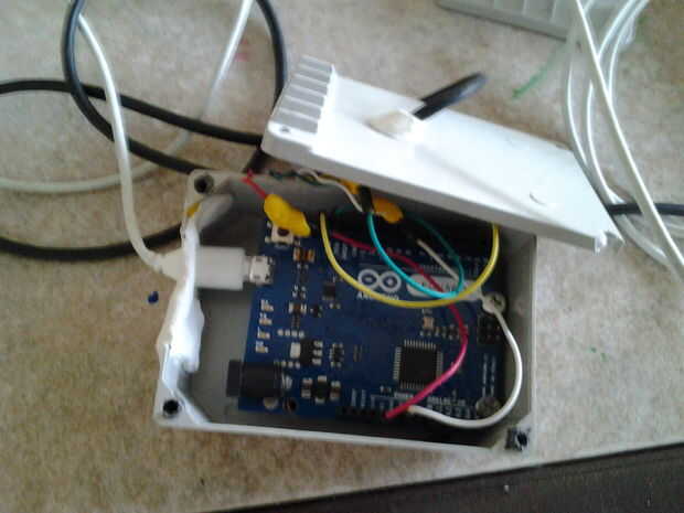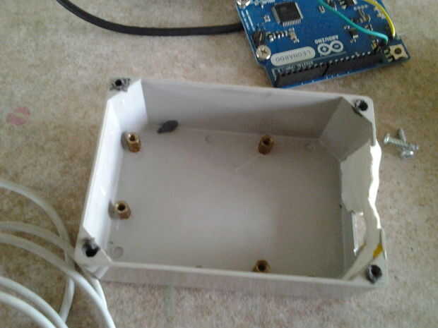 En la época que construyó este proyecto, yo trabajaba para una empresa de fabricación de fuentes de alimentación. Tenía un número de cajas de plástico de desecho moldeado que eran un tamaño maravilloso para montar un Arduino en. Yo primero algunos agujeros perforados en caso donde os adjunto algunos separadores de PC para montar la Junta. Después de eso, corté un agujero en el lado de la caja para correr algunos cables a través. Inicialmente intentó ejecutar el cable del Nunchuck sí mismo a través de este agujero en el lado, pero izquierda no hay espacio para el cable USB. Terminé corriendo el cable del Nunchuck a través de un agujero en la tapa, que salió más o menos perfectamente.