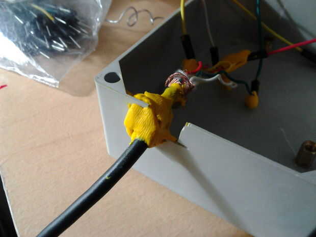 Guardé todos los cables en su lugar y aislado con un poco de Sugru. Había ido un poco por la borda en el agujero corte en el lado y tuvo apuntalar con algunos Sugru así. He dejado suficiente espacio que pude enchufe o desenchufe el cable USB de la placa fácilmente incluso cuando fue sellado el caso.