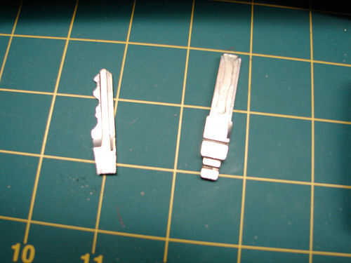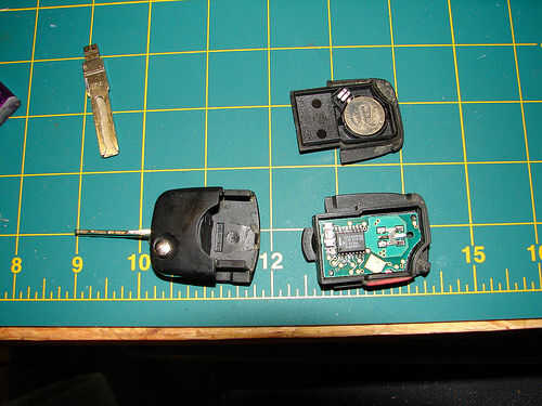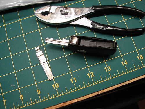 El transmisor viene aparte fácilmente. Una vez abierto, retire los componentes y deseche. Luego retire la llave del coche viejo. Use un clavo pequeño o un clip para quitar el pasador de bloqueo que mantiene en su lugar. Tomé la llave que quería sustituirlo y cortar con una hoja de sierra para metales a una forma áspera. Luego lo pongo en mi amoladora de banco hasta que fue de la misma forma que la llave original de VW. Utilicé una herramienta Dremel y la sierra puso una pequeña muesca en el lugar derecho para aceptar el pasador de bloqueo. Introduzca la nueva clave y bloquearlo con el pasador. Esto tomó cerca de 10 minutos de prueba y error... realmente no es demasiado difícil.