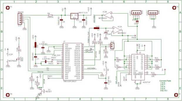 El hardware se construye alrededor de un micro-controlador de TMS320F28027 un ADG714 switch 8-puertos analógicos de los dispositivos analógicos y un Microchip rail to rail doble amplificador operacional MCP6022.