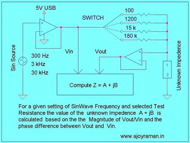 Esta aplicación se basa en el principio de medir el voltaje (amplitud y fase) a través de una impedancia desconocida cuando alimentado una ola de pecado de conocida frecuencia y amplitud a través de una resistencia conocida.