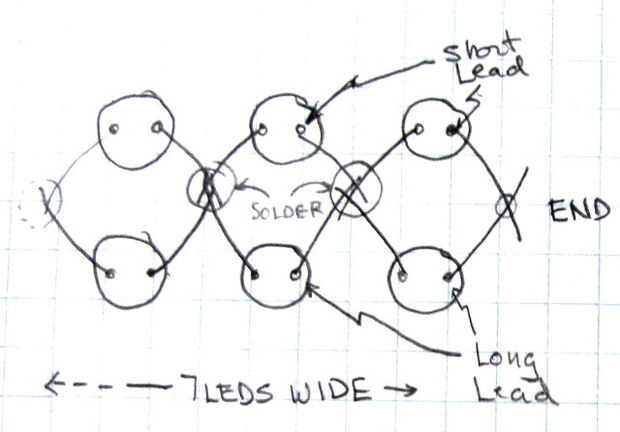 Se junta los LEDs en un enrejado - ver la segunda imagen. Excepto las unidades finales, cada LED debe tener un cable tocando otros 3 LEDs.