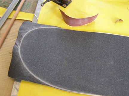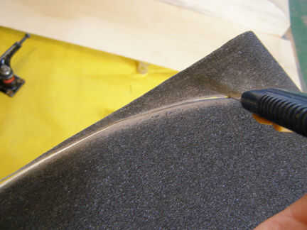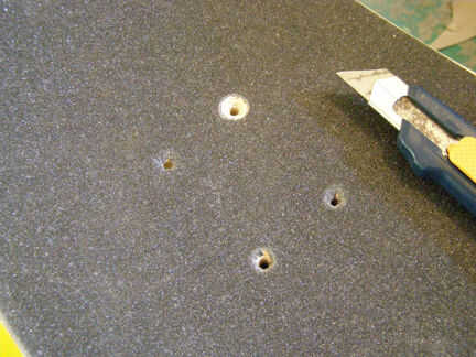 Una vez que la cinta agarre on,(fig.4t), que es necesario recortar para igualar los bordes. Tomar un viejo pedazo de papel de lija y frota la cinta de agarre sobrante en los bordes, esto ablandará y dejar una marca fueron necesita cortar. (fig.4u) tomar un cuchillo del exacto y correr alrededor de los bordes. (fig.4v) si hay cualquier pedazos restantes se puede utilizar el papel de la arena y arena apagado. A continuación, se sienten donde los agujeros de la carretilla en la parte superior y stab y equipamiento hacia fuera con el cuchillo. (fig.4w)