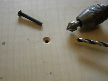 Busque donde quiera sus ruedas adjuntadas y marque la ubicación de los orificios con un lápiz en la parte inferior de la cubierta. (fig.4o) Taladre el primer agujero y luego atornille el camión en el lugar. Entonces puede usar los agujeros de la carretilla como guía para perforar los agujeros próximos, garantizando que se alinean correctamente. Una vez que los agujeros se perforan Retire los tornillos y utilice un fregadero contrario de las tapas de los agujeros para que el tornillo se acostará al ras con el tablero. (fig.4p)