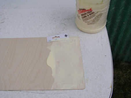 Tomar la capa uno (grano va a lo ancho) Aplique una capa de pegamento de madera sobre la superficie hasta la capa del lugar de edges,(fig.4c) 2 (va a lo largo de grano) en la parte superior y Aplique pegamento sobre la superficie hasta los bordes y colocar la capa 3 (grano va a lo ancho) en la parte superior. Ahora se acumulan las 3 capas pegadas centradas en la parte superior del molde. (fig.4d) puede poner cuatro fichas de cinta de enmascarar en los bordes de la madera para asegurarse de que no se deslice alrededor cuando usted pone en la bolsa.