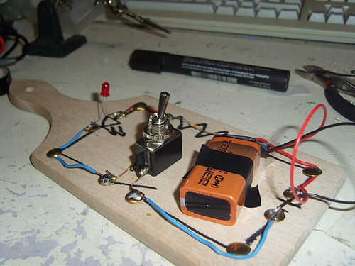 Se podría pensar, esta técnica está limitada a circuitos simples como demuestro aquí, pero circuitos más complejos son posibles. Por ejemplo aquí se puede ver una radio AM construido usando un protoboard y chinchetas.
