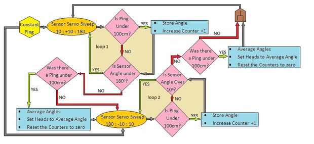 Si no hay nadie delante del OVNI, no pasa nada y el Sensor del Sonar simplemente arrasa. El programa decide si la distancia detectada es dentro de una ventana declarada, lo que significa que hay una persona en rango útil del proyecto. Si la distancia es la adecuada, el programa almacena el ángulo asociado a la distancia. El Sensor Sonar a "ping" de una persona en múltiples ángulos porque las personas son grandes! El programa agrega todos los ángulos y los promedios. Una vez que se encuentra un ángulo promedio, el programa envía los Servos de la cabeza a ese ángulo promedio. Esto hace que la mirada de cabezas en el centro del cuerpo de una persona y arrastrarse hacia fuera. Si una persona mueve a posiciones frente a los ovnis, el Sensor "ping" en diferentes ángulos, el programa toma un promedio de nuevo y enviar las cabezas para mirar a un ángulo diferente.