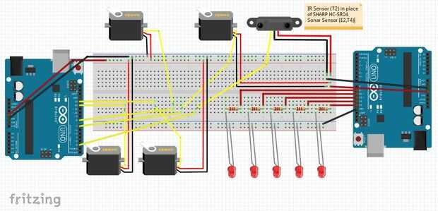 El esquema es como un plato de espagueti, pero si se toma tiempo, puede ser seguido. Una nota sobre el Arduino controlar los Servos y el Sensor es que todos los pasadores de modulación de anchura de pulso se evitan.