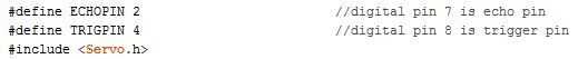 Este código debe ser cargado en el Arduino primeros. Comienza definiendo las patillas eco y gatillo en el Sensor conectarse a los pines 2 y 4 en el Arduino. También se llama la biblioteca de Servo.