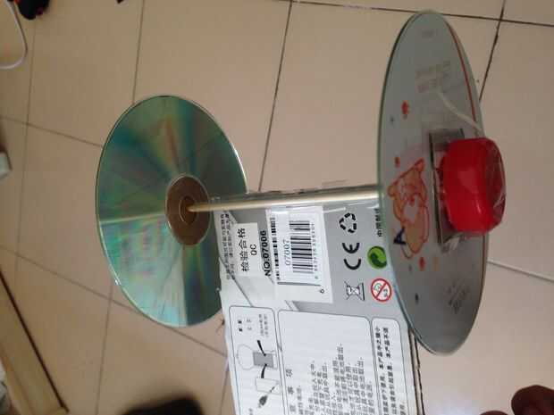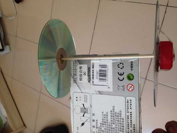 hacer otra rueda con la parte superior de la botella, cartón y el CD. Fije la rueda de nuevo en la rueda que ya inti la paja