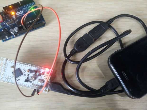 Prueba de programa de aplicaciones Android, utilizar el teléfono móvil como la próxima tripulación, IOIO-OTG como un PC, es que conecte el USB para el teléfono móvil con el cable del dispositivo esclavo y conecte el USB a OTG IOIO con el cable del dispositivo anfitrión. Como la figura siguiente: