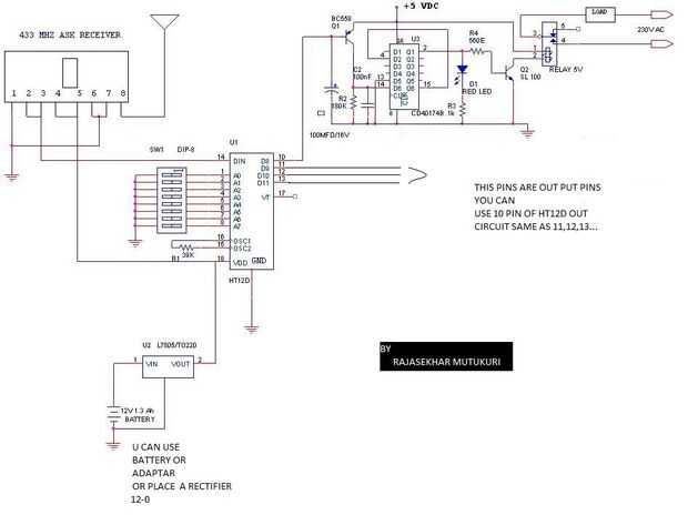Cuando se recibe ninguna señal en el pin de datos de HT12D, permanece en modo de espera y consume muy menos corriente (menos de 1μA) para una tensión de 5V. Cuando el receptor recibe señal, se da al pin DIN (pin14) de HT12D. A la recepción de la señal, se activa el oscilador de HT12D. IC HT12D luego decodifica los datos en serie y comprueba los pedacitos de dirección tres veces. Si estos bits coinciden con los pines de dirección local (pins 1-8) de HT12D, luego pone los bits de datos en sus pines de datos (pines 10 al 13) y hace el pin VT altos. Un LED se conecta al pin de VT (pin17) del decodificador. Este LED funciona como un indicador para indicar una transmisión válida. Así se genera la salida correspondiente en las clavijas de datos del decodificador IC. Una señal es enviada por bajar alguna o todas las clavijas 10-13 del HT12E y se recibe la señal correspondiente en el extremo del receptor (en el HT12D). Bits de dirección se configuran usando el usando los pernos primero 8 de ICs de codificador y decodificador. Para enviar una señal particular, pedacitos de dirección deben ser igual en el codificador y decodificador ICs. Configurando correctamente los bits de dirección, un solo transmisor de RF puede utilizarse también para controlar diferentes receptores de RF de la misma frecuencia.