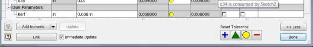 Como ya he mencionado que estará cortando las piezas hacia fuera usando un cortador láser así que tenemos que mantener el corte en mente cuando se agregan las muescas. Para obtener más información sobre corte vea este Instructable. Para cada pieza será agregar un parámetro para ajustar el tamaño de la ficha sobre la marcha. Para agregar el parámetro seleccione la pestaña "Manage". Una vez que el cuadro de diálogo de parámetro es añadir un parámetro llamado corte y establezca el valor en el corte de la cortadora láser se utiliza para cortar las piezas.