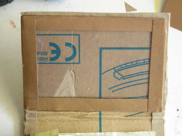 Aquí. Cortar cartulina en tiras de 3/4 de pulgada y tiempo suficiente para hacer una frontera totalmente alrededor del compartimiento. Rescatado una pieza de plástico de un paquete que tenía en mano, cortado a las dimensiones de 3 y 7/8ths de 2 7/8ths en.