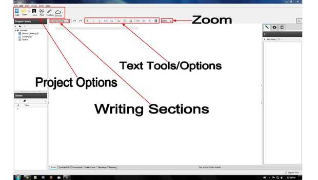 En la barra de la Opción de proyecto puede abrir proyectos guardados de nuevo o previamente. También puede guardar a Celtx Online (característica favorable) o al ordenador. En esta barra también permite agregar componentes del proyecto tales como; juego de la pantalla, guión, storyboard, catálogo maestro y registro de audio.