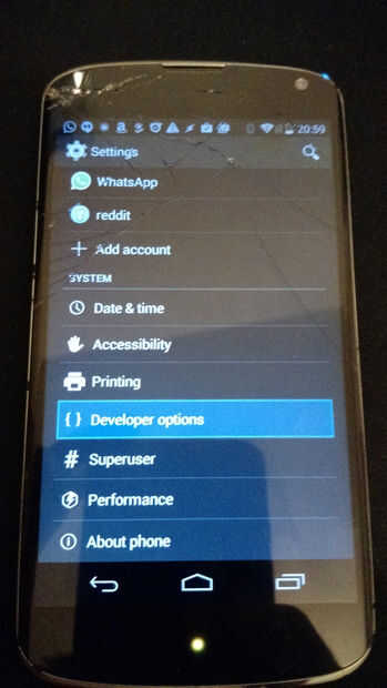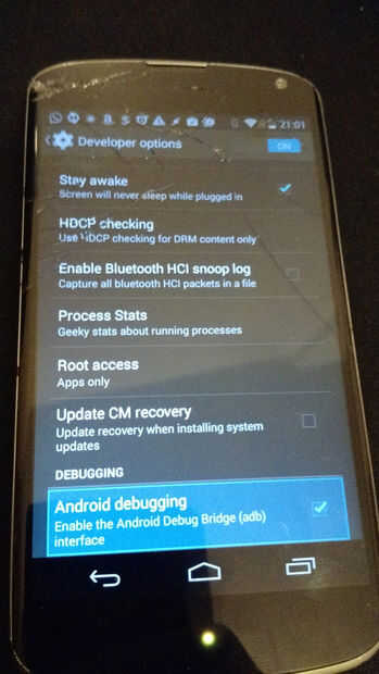 Utilizando los mismos principios que se indica antes, debe ser capaz de navegar por cada elemento en el menú de configuración. Ir a las opciones del desarrollador, enviar comandos de "Keypad_Dpad_Down" (keyevent entrada 20) luego activar Android depuración ADB.