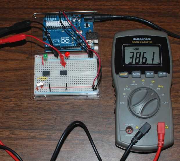 Ahora regresa en el IDE de Arduino y defina el tipo de junta "Attiny85 (reloj interno de 8 MHz)" quemar el cargador de arranque y volver a cargar el programa. La segunda foto muestra 488 Hz a una velocidad de reloj de 8 MHz.