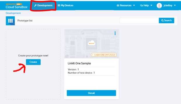 Después de haber creado su cuenta, usted querrá dirígete a la pestaña de 'Desarrollo' y haga clic en 'Crear' para que podamos crear un nuevo prototipo!