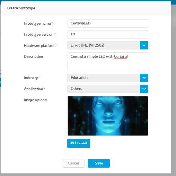 Usted querrá entrar en algo de información básica para crear el prototipo. He nombrado mi prototipo 'CortanaLED' y decidió poner una imagen de Cortana me encontré allí con él. No necesitas incluir una imagen si no quiere.