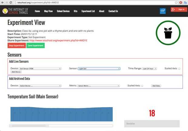 Una agradable - ha creado un experimento básico! Desde aquí puede Agregar sensores de vivo para comparar un sensor a otro (incluso un sensor de otro dispositivo), puede Agregar los datos archivados (como fenómenos meteorológicos extremos o más allá de experimentos) para comparar contra datos en vivo, puede utilizar los controles deslizantes para expandirse y contraerse el intervalo de tiempo que usted está buscando en y se puede Agregar en anotaciones para ayudar a usted encontrar fácilmente puntos de datos clave. Nos hemos anotado algunas de las principales características en la imagen de arriba.