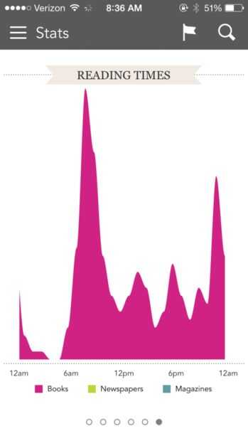Como se aprecia en el gráfico de mi lectura, soy una lectora de viaje y dormir por la mañana. A veces también leer durante el almuerzo o en la noche viaje.